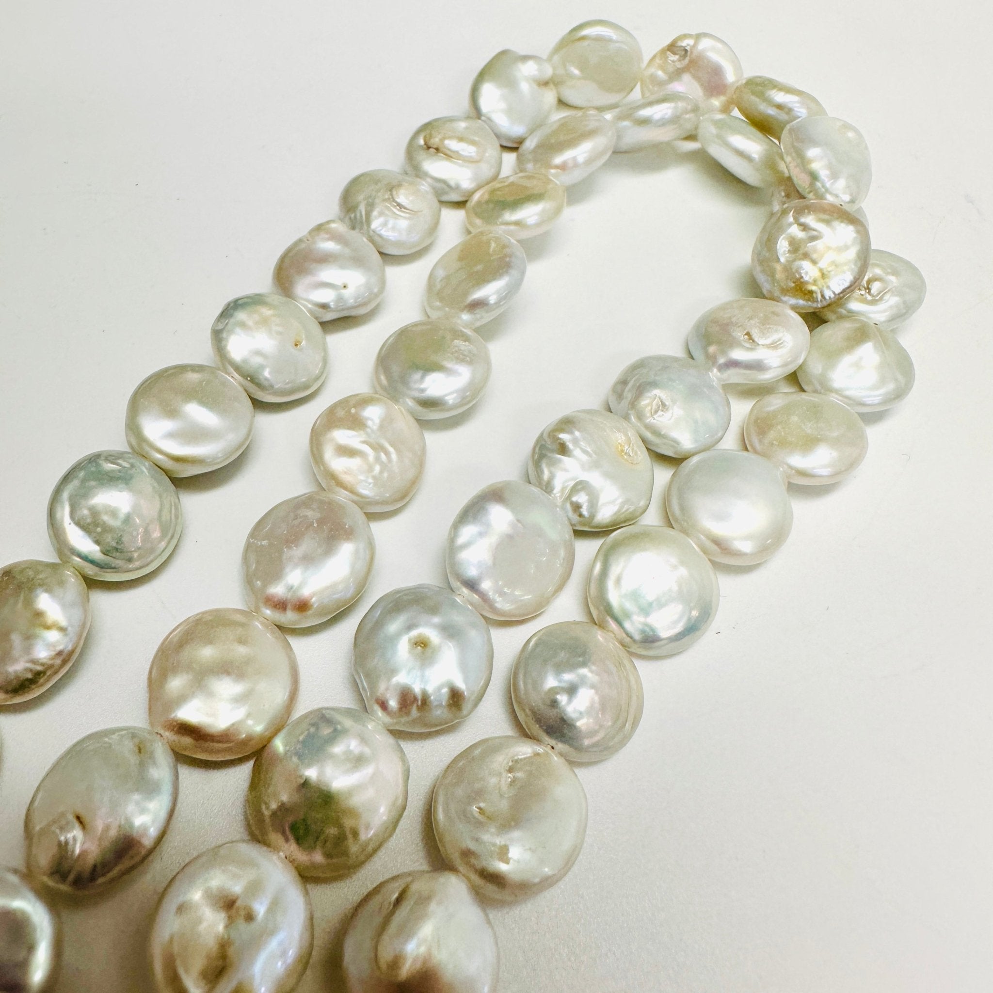 Natural Freshwater Pearl Flat Coin Round Beads 13 -14 mm -15.5"inches Strand White Iridescent